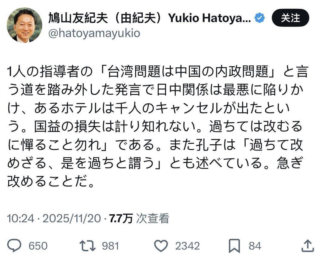 就近期日本首相高市早苗涉台错误言论,日本前首相鸠山由纪夫当地时间20日再次发文:“因为一名领导人发表了偏离‘台湾问题是中国内政’这一正道的言论,日中关系几乎陷入最恶劣的境地,据说有一家酒店出现一千人取消预订的情况。国家利益的损失无法估量。”